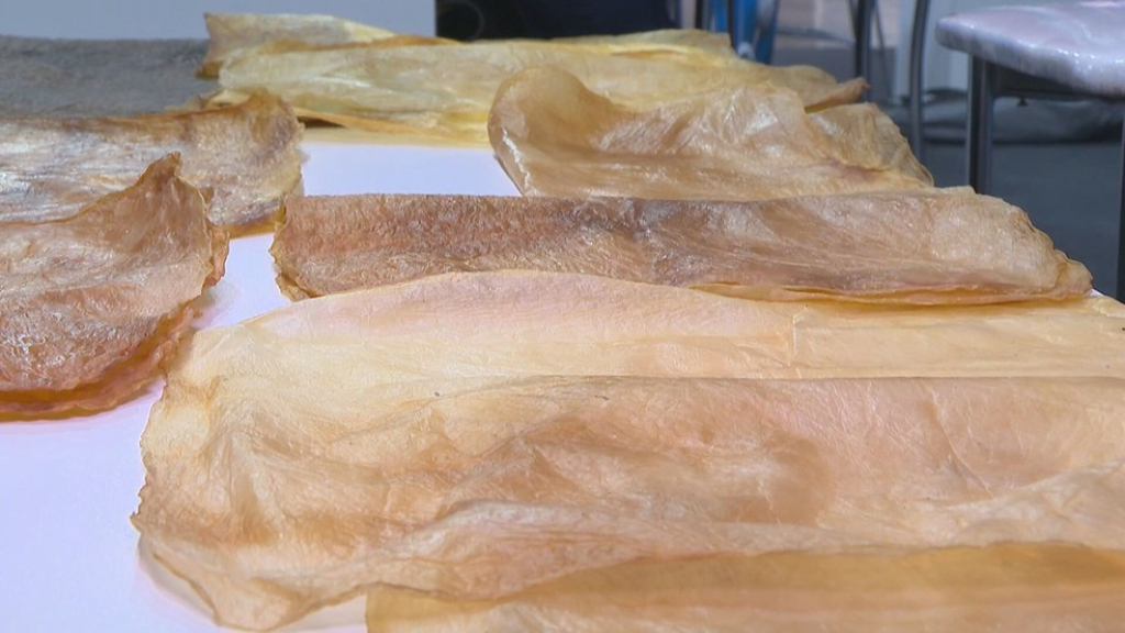 A inovação está no estande da UFRJ. O material pode ser produzido em várias versões. Em uma delas, ele possui textura mais flexível. Em outra, ele é mais firme e pode ser usado em bolsas e roupas.