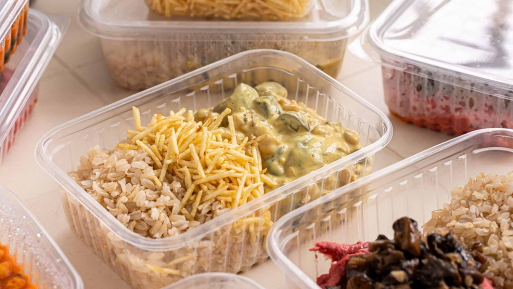 Marmitas vegetarianas com ingredientes que se combinam em diversas versões", ele aponta sobre as combinações, que podem ser congeladas por 30 dias, ou armazenadas por 5 dias na geladeira.