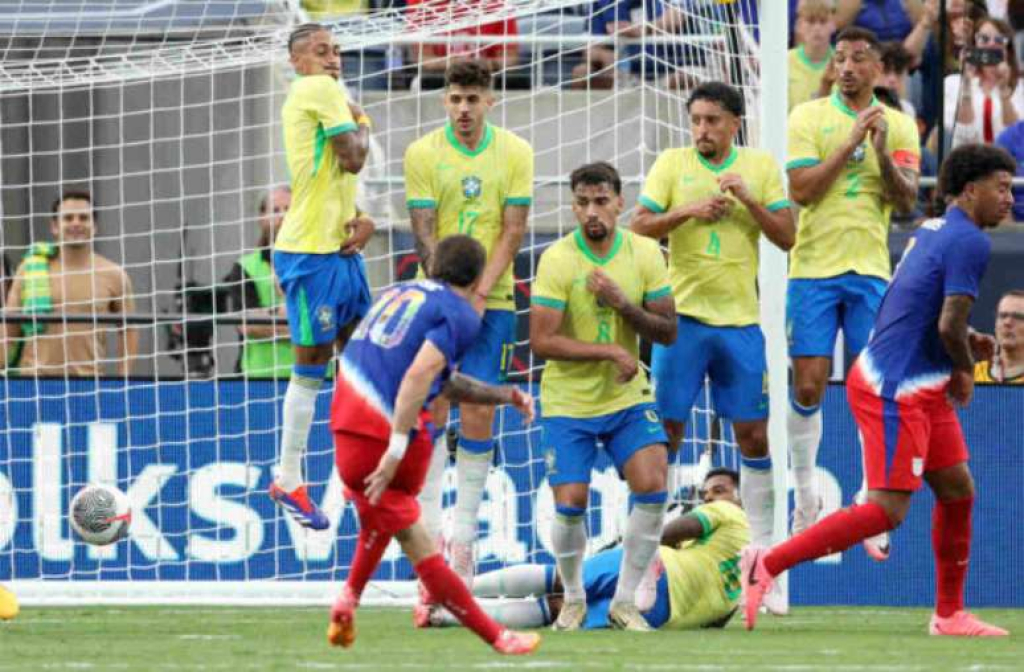 Rodrygo perdeu grande chance pouco depois. Mas a verdade é que a Seleção cedeu espaços para o time americano, mesmo com três jogadores bem defensivos (o lateral Danilo praticamente era um zagueiro). Aos 25, Pulisic sofreu falta de João Gomes quase na risca da área. O mesmo Pulisic cobrou. Beneficiado por uma péssima barreira armada por Alisson e ainda uma falha do goleiro que demorou para ir na bola, deixou tudo igual.