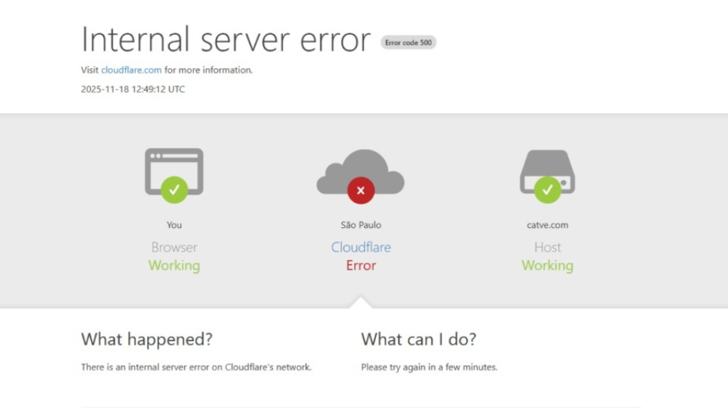 Ao tentar acessar páginas hospedadas na rede da empresa, usuários passaram a visualizar mensagens de “erro interno no servidor”, impossibilitando o carregamento de conteúdos. O Down Detector, serviço que monitora quedas de plataformas digitais, também apresentou falhas e ficou inacessível em alguns momentos. Quando operante, apontou aumento expressivo nos relatos de instabilidade.